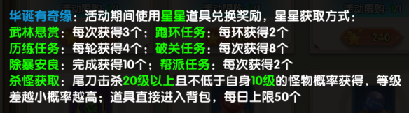 活动期间每日完成活跃任务可获得活动道具“星星”,在野外地图击杀20级以上且不低于自身等级10级的怪物也有概率获取。